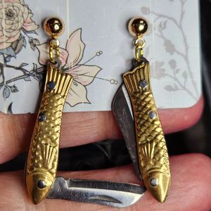 0 savesFeeling Stabby Mini Stainless Knife Earrings. Real Mini Knives on Gold Plated Stainless Steel posts. About 1.5" long.