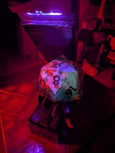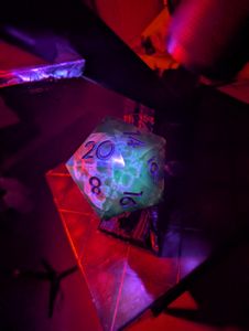 The Skull in the D20 has glow in the dark ink on it, and when you place it on the stand it lights up blacklights to show the glow in the dark in. This is my first prototype of this sort of die so it's priced accordingly (your basically getting it at cost). Check out my full video here: https://www.tiktok.com/t/ZP8A6fxU6/