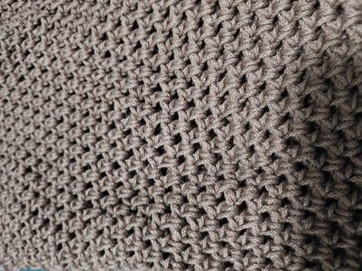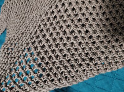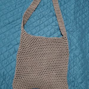 Crocheted market bag. Made with gray cotton yarn. Measures 24 inches long (shoulder strap included) and 15 inches wide.