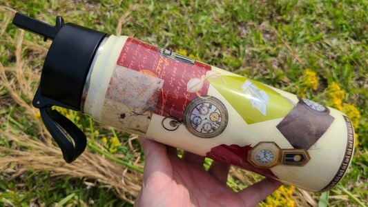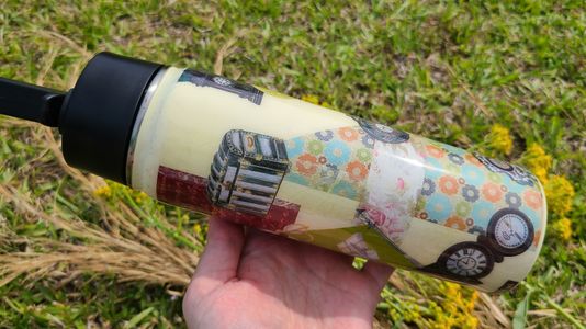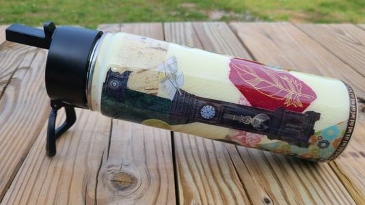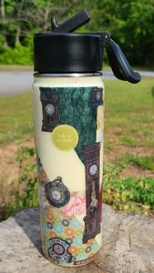With an emphasis on clocks and gears, there is an underlying steampunk aesthetic to this one of a kind custom water bottle. Inspired by the hobby of creative journaling, this one o...