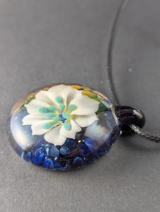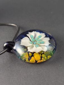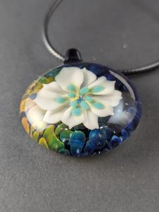 0 savesWhite flower pendant with a fumed background. Borosilicate glass on a braided cord.
