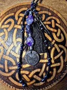 This talisman was made with steady focus and the intention of honoring Hekate’s path and presence, amplifying the work the wearer does in her name. It has been consecrated in that current. The focal stones are rough-cut amethyst, paired with a bronze-colored key and a black tassel for that sense of thresholds and movement through liminal space.