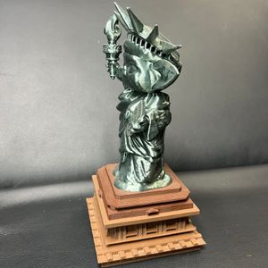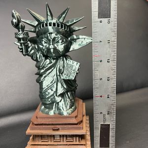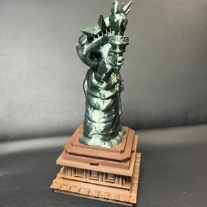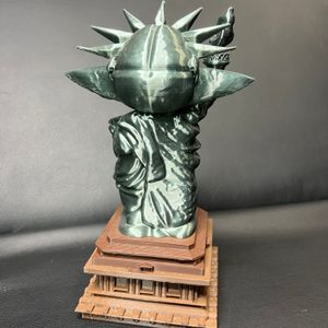 Hex 3D designed Statue of Liberty Grogu statue. 3D printed in silk metallic green and brown PLA filaments. Stands about 9” tall with a 4”x4” base. The placard in Grogu’s hand reads “This is the way”