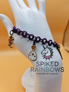 Chainmail bracelet made from Anodized Aluminum rings and enamel charms. Measures to be 8 inches long. Will ship within 3 business days of order.