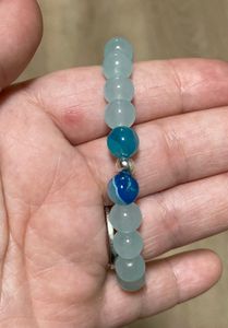 A glass seahorse adorns this charm bracelet with aquamarine gemstone beads and two dark blue agate beads. A must for any lover of the sea! Stretch, fits most wrists.