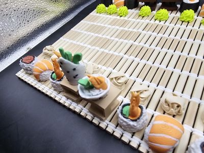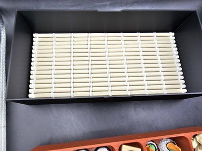 *A miniature sushi rolling mat that unfolds into a chessboard.