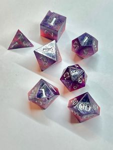 Pink marbled with purple ink dice set. Beautiful swirls and shimmer for the character who’s giving Princess!