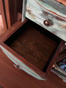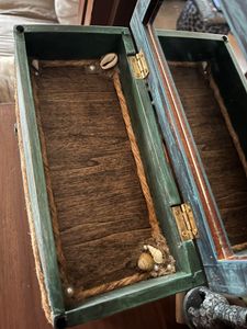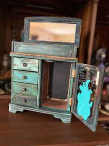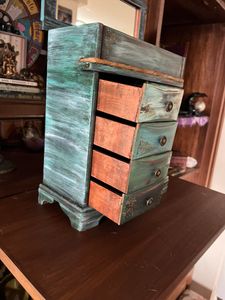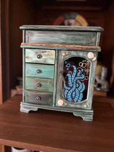 Repurposed thrifted jewelry box into an altar cabinet. New drawer bottoms and velvet lining. Imside has battery operated star lights (switch on back) really sand and sea shell accents. Map drawer sides and more map motif inside. Hand painted glass front! One of a kind! 11" Height, 10" width, 4 1/2" deep.