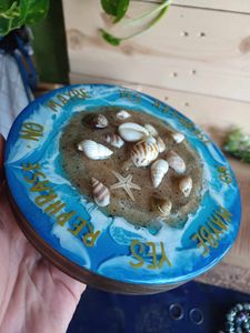 1 inch thick pendulum board at 6 inch diameter topped with resin, sand, and shells to create a unique pendulum board. Includes custom seashell pendulum with display tray.