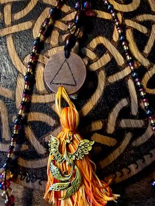 This talisman was created with care and steady attention. The wooden pendant is stained in a red-leaning maple tone and hand-burned with the symbol for Fire. The colors in the strand rise and fall like heat: red, gold, and matte black glass beads set against dark wood, giving the whole piece a warm, restless pulse.