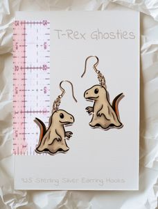 Dinosaur Ghost Sterling Silver Hook Earrings. These measure approximately 1"H (One inch high) not including the hook height. They are only printed on the front, the back is blank {white}