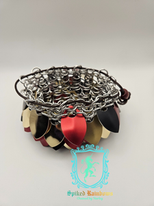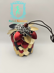 Anodized Aluminum Scales and rings made into a pretty bag. Perfect for holding your trinkets. If you collect dice, this bag can hold approximately 5 sets. Leather cord and wooden bead for closure.