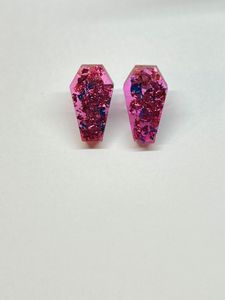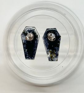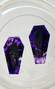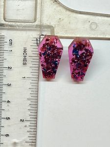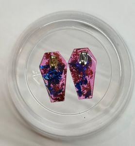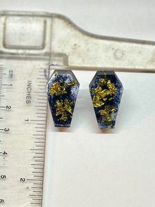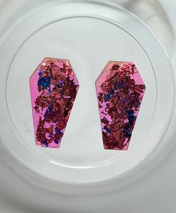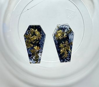 3 savesHand poured resin coffin stud post earrings. Each coffin features colored foil, resin, and drops of ink to create a swirled background. No two pair are the same.