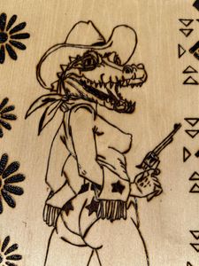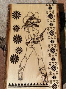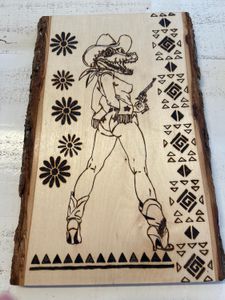Crocodile Cowgirl – Original Western Pyrography Wall Art Add some untamed western charm to your space with “Crocodile Cowgirl”, an original piece of hand-burned pyrography art. Cr...