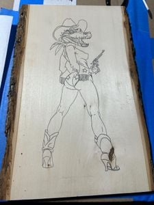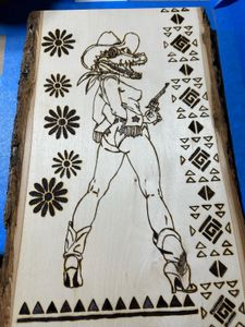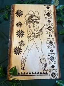 Add some untamed western charm to your space with “Crocodile Cowgirl”, an original piece of hand-burned pyrography art. Crafted over 8 hours of detailed wood burning, this bold and rustic cowgirl-meets-crocodile design is sure to turn heads and spark conversation.