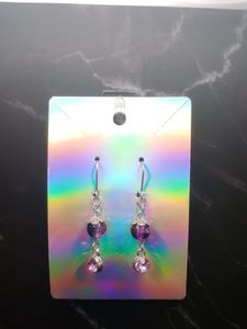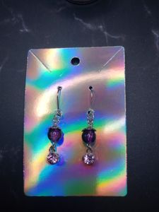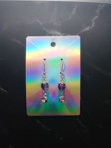 Short purple and black cracked glass bead with light purple rhinestone dangle earrings and stainless steel leverback french earring hooks.