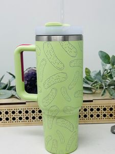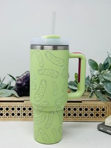 Pickle 40oz laser engraved tumbler with handle. It's insulated so works perfectly for both hot and cold drinks. UNBRANDED tumbler that I directly import, hence the lower price point