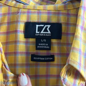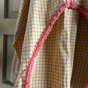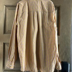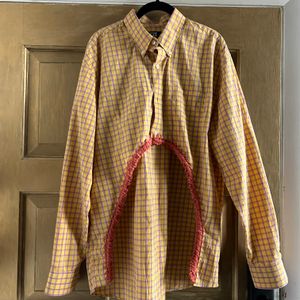 One of a kind flirty top. Men’s large button down with cut out front and crochet (done by me) trim. Machine washable, gentle cycle. Includes s&h.