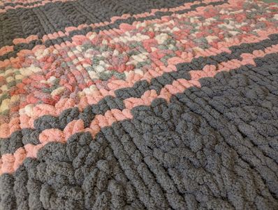 Dreamy length! Rose Tinted Glasses Blanket features grey/pink/white butterfly stitch. Extra-long 42ร74in, chunky chenille โ purr-approved by Miss Midge! ๐ธ