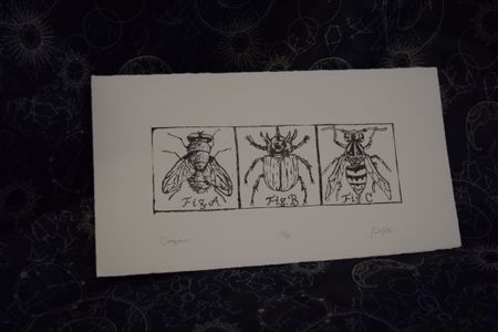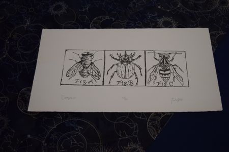 0 saves"Diagram", Black and white print of a fly being fig. A. a beetle being fig. B and a wasp being fig. C. 7x13