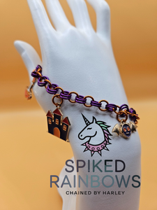 Chainmail bracelet made from Anodized Aluminum rings and enamel charms. Measures to be 8 inches long. Will ship within 3 business days of order.