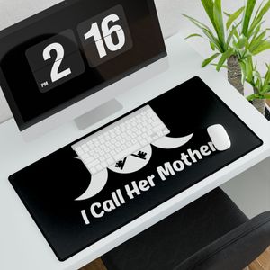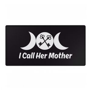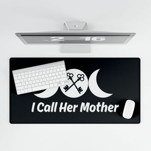 A black desk mat that brings witchy charm to any workspace. The bold white triple-moon emblem and crossed keys sit like a quiet sigil at the center, with the phrase, “I Call Her Mother” beneath.