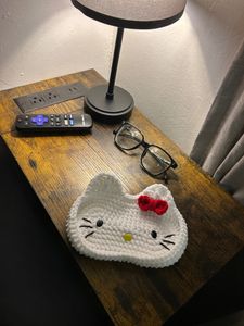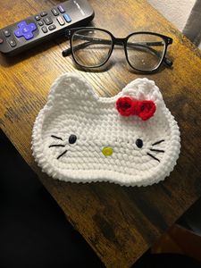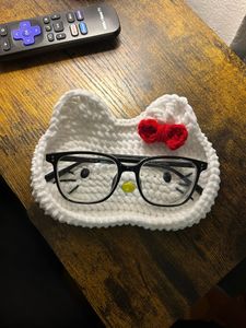 Handmade with soft chenille yarn and finished with a signature red bow, she is inspired by the beloved classic Hello Kitty character while remaining a unique handmade piece. She’s perfect for desks, nightstands, bookshelves, or anywhere you tend to set your glasses down “just for a second.”