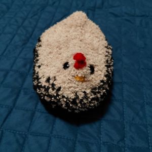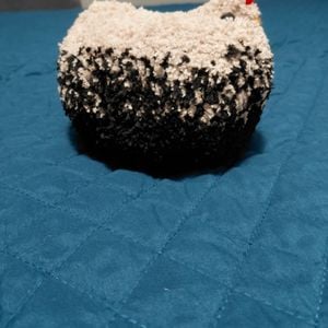 Fluffy, weighted, crochet emotional support chicken. Colors of black and tan. Weighted with poly beads and poly fill. Measurements are 8 inches in length, 5 inches wide, 5 inches tall. Weighs roughly 2lbs.