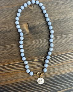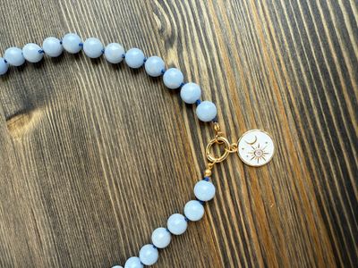 1 savesThis sky blue necklace features 10mm Angelite beads hand knotted on navy colored silk thread. Finished with a gold filled oval hinge clasp and a gold filled celestial charm. Necklace is approximately 17.5inches in length and is not adjustable.