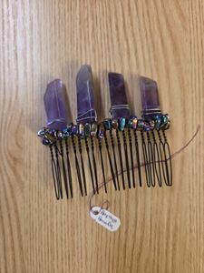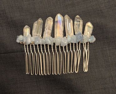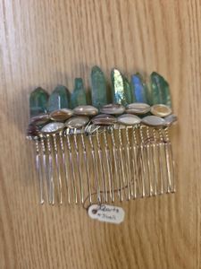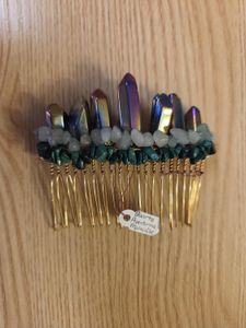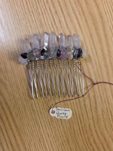 A Quartz and aquamarine B Amethyst and rainbow hematite C Quartz and shell D amazonite, pearls, hematite E Quartz, aventurine, malachite F Quartz and fluorite
