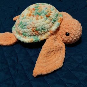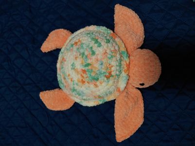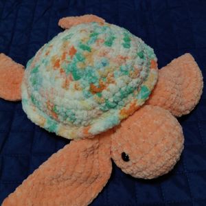 Watercolor Crochet Sea Turtle. Multicolored pattern and orange/peach color. Measures 12 inches long and 10 inches wide