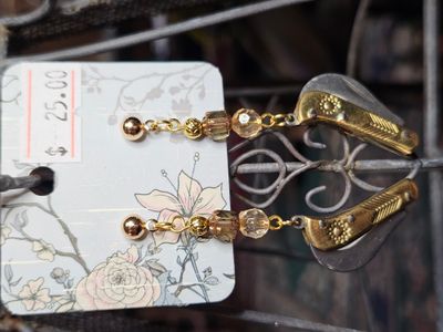 Feeling Stabby Brass Floral Curve Knife Earrings Crystal Beads. Gold Plated Stainless Studs