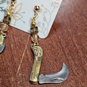 0 savesFeeling Stabby Mini Brass Knife Earrings. Real Mini Knives Gold Plated Stainless Steel Studs. About 2.5" long. Crystal Beads.