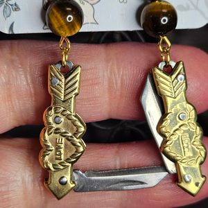 0 savesFeeling Stabby Mini Stainless Knife Earrings. Real Mini Knives on Gold Plated Stainless Steel Posts. About 2" long. Tiger Eye and Gold Rose Beads