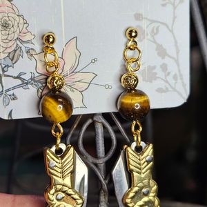 Feeling Stabby Brass Love Knife Earrings Tiger Eye Beads