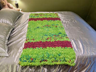 Cozy lap size! “Neon Haze” Blanket in green butterfly stitch with purple stripes & blue speckles. 50x26in, ultra-soft chenille – purr-approved. 🦋