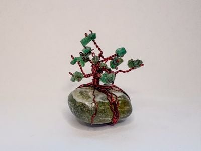 This handmade wire tree figurine is rooted on a smooth natural stone base and decorated with African jade beads, giving it a rich, earthy charm.
