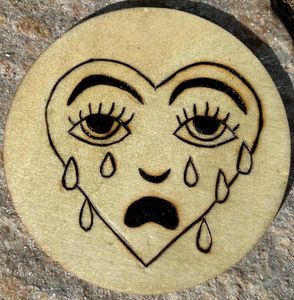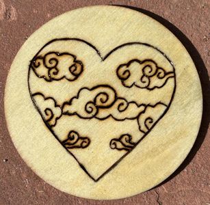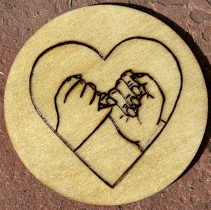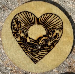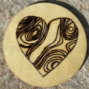 Each coaster is a 3-inch round piece of natural wood, featuring a unique heart design carefully wood burned by hand. Every one of the nine hearts has its own look — making each coaster one-of-a-kind.