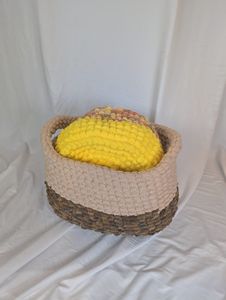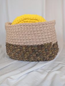 Stylish storage. “Earthbound Basket” in khaki, tan, and brown, hand-knit with handles. 15-gallon capacity, sturdy and soft alternative to plastic bins. 🧺🤎