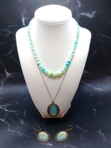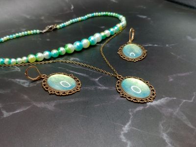 0 savesVintage style dark gold color pendant earrings, pendant necklace, and imitation pearl necklace set. Made with glass cabochons and a resin underlay with silence forest color holographic mica powder to create a unique color shift effect that changes beautifully in various light. The vintage style pendant necklace is on a dark gold color stainless steel chain with a magnetic closer. The imitation pearl necklace is made with varying size imitation pearl beads that are a gradient green, blue, yellow and white color, with a silver lobster claw closer. The matching vintage style pendant earrings are on 24K gold plated stainless steel french leverback earring hooks.